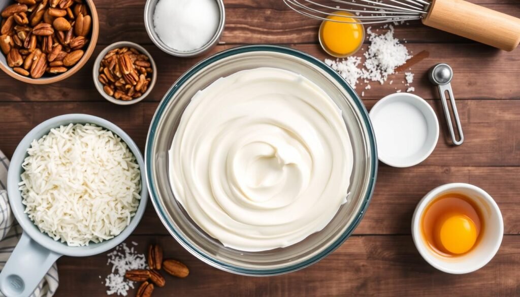 Start with the best shredded coconut and fresh pecans. Then, mix sugar, evaporated milk, and egg yolks on low heat to avoid burning. Getting these steps right makes your frosting creamy and delicious.