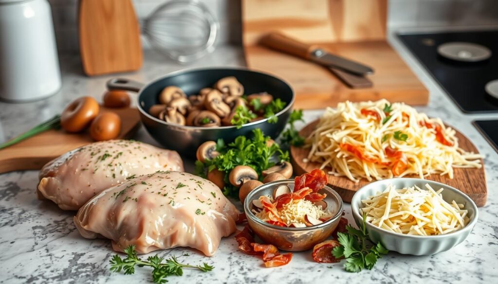 You’ll need chicken breasts, bacon, mustard, honey, mayonnaise, yogurt, onion flakes, mushrooms, and cheddar cheese.