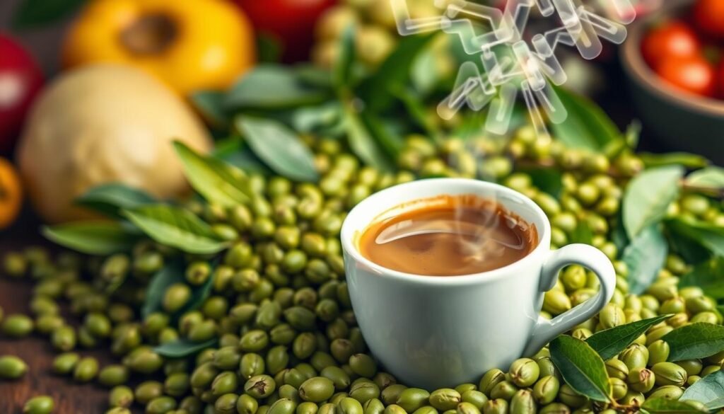 Adding green tea extract to caffeine might increase fat loss by up to 35%. Coffee’s chlorogenic acid could also help by slowing down how we absorb carbs. This could lead to better sugar levels in our blood.